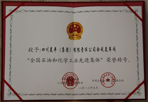 2013.06.30公司合成氨车间荣膺“全国石油和化学工业先进集体”称号6月25日,第二届全国石油和化学工业劳动模范表彰大会在北京隆重召开,中华人民共和国人力资源和社会保障部、中国石油和化学工业联合会联合表彰了全国石油和化学工业先进集体、劳动模范和先进工了解更多